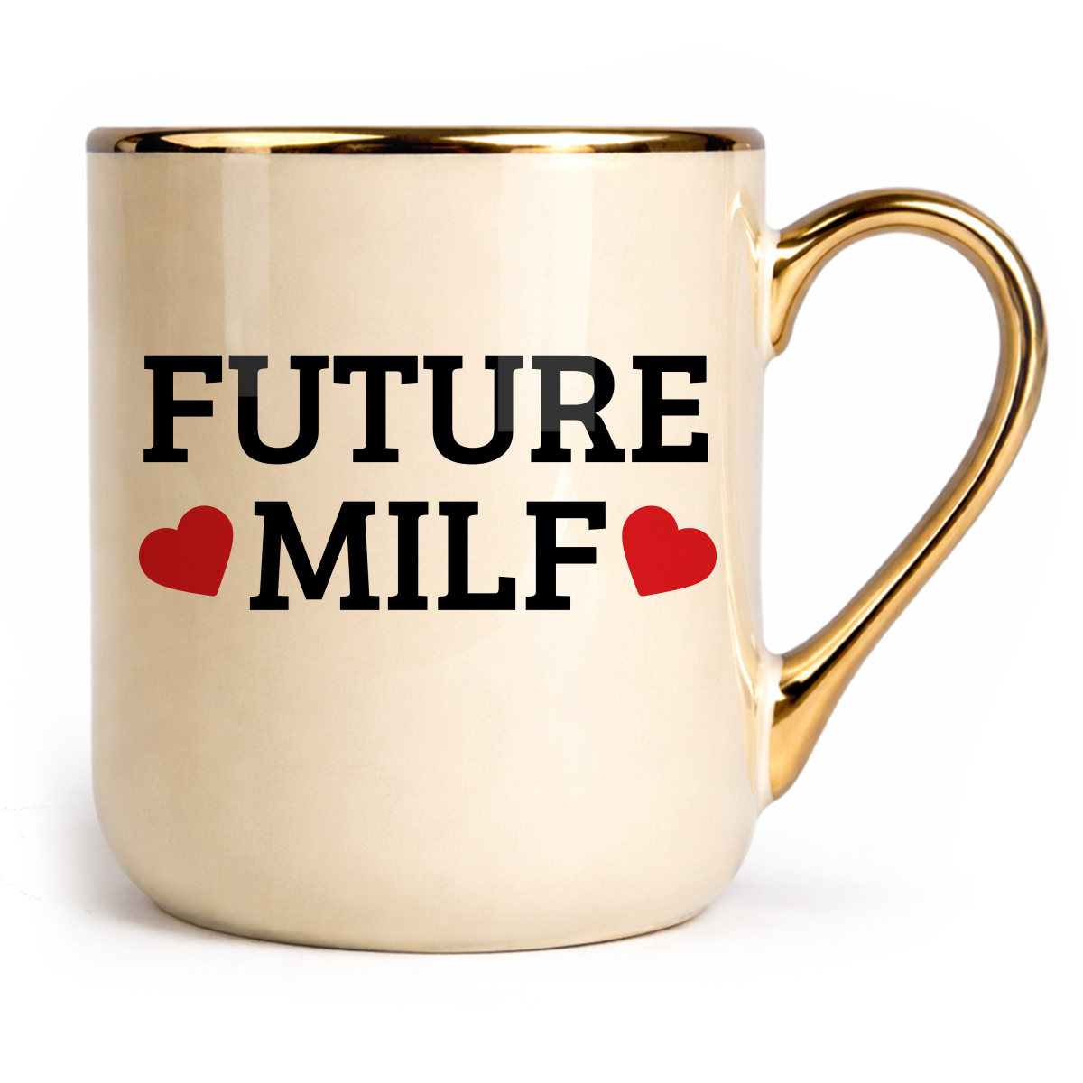 Ceramiczny kubek 330 ml z trwałym, nadrukiem po obu stronach. Kremowy i błyszczący ze złotym uchem oraz rantem, idealnie sprawdzi się jako prezent.