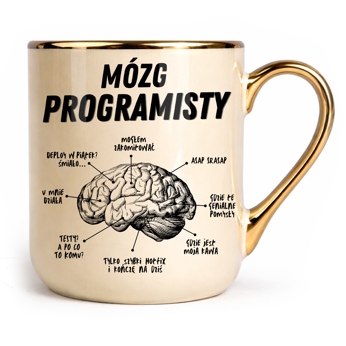 Ceramiczny kubek 330 ml z trwałym, nadrukiem po obu stronach. Kremowy i błyszczący ze złotym uchem oraz rantem, idealnie sprawdzi się jako prezent.