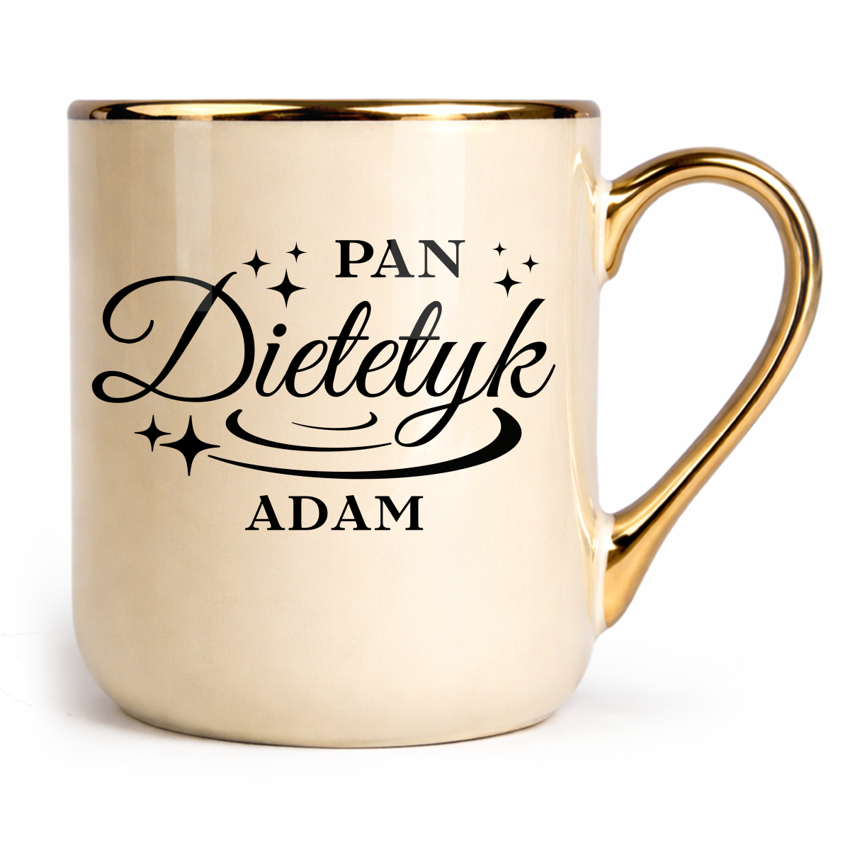 Ceramiczny kubek 330 ml z trwałym, nadrukiem po obu stronach. Kremowy i błyszczący ze złotym uchem oraz rantem, idealnie sprawdzi się jako prezent.