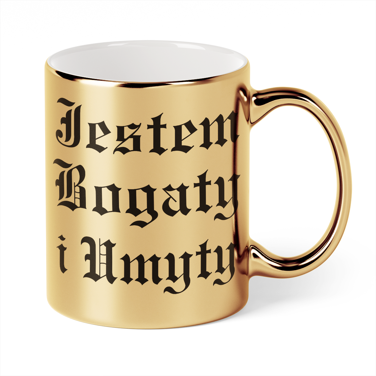 Ceramiczny kubek 330 ml z trwałym, nadrukiem po obu stronach. Złoty i błyszczący, idealnie sprawdzi się jako prezent.